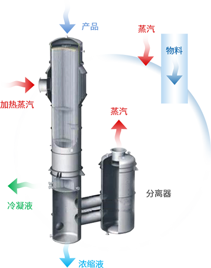 降膜蒸發(fā)器,具有濃縮比大、粘度范圍寬、壓降小、傳熱效果好、處理量大等優(yōu)點。在乙二醇、乙醇胺、己內(nèi)酰胺、苯乙烯、烷基苯酚、腈綸、滌綸、氯堿、聚碳酸脂、水處理等石油化工裝置及輕工、食品行業(yè)有廣泛的應(yīng)用。